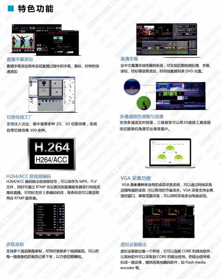 整套系統(tǒng)集成度高,現(xiàn)場直播,移動導(dǎo)播,全景制作車載一體機。便于小車裝載,實現(xiàn)直播車功能。具備有線/無線高標(biāo)清視頻傳輸系統(tǒng)、攝錄傳感數(shù)據(jù)控制系統(tǒng)、音視頻采集錄制系統(tǒng),導(dǎo)播切換系統(tǒng),通話系統(tǒng)。配置高標(biāo)清HD/SD 8/12通道切換臺,19吋液晶監(jiān)視器,4K/8K編碼器,硬盤錄像機,延時器等。標(biāo)配8路,選配12路輸入且兼容于HD或SD信號同時輸入與切換、擴增12組輸入與雙DSK的功能,內(nèi)建字幕卡,支持1920x1080P的信號輸入,兼容目前大部分品牌之?dāng)z像機信號,同時也能用簡單的方式就讓導(dǎo)播播出的信號具備字幕效果,兩件式的設(shè)計便于整合系統(tǒng)中且不影響空間的運作,同時預(yù)算成本符合各級使用單位的預(yù)算需求,是一套運動賽事、副控室或?qū)Рボ囀褂玫难莶ハ到y(tǒng)