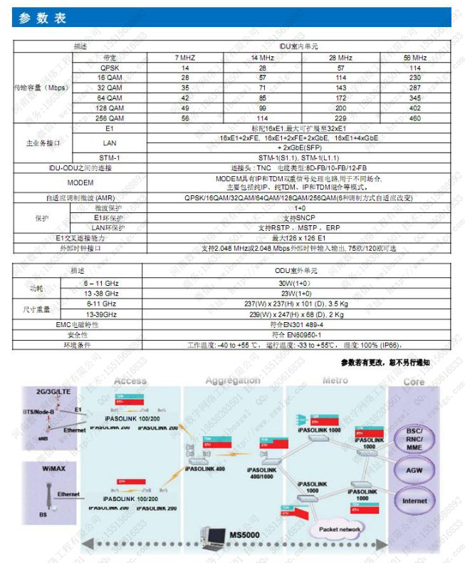 3、PTN數(shù)字微波:1+0配置,集成TDM交換、分組交換及微波光纖特性于一體的數(shù)字微波系統(tǒng),是匯聚新一代分組IP微波高集成化產(chǎn)品。接口類型豐富、配置靈活,節(jié)約了投資成本、有效地提高了數(shù)據(jù)通道利用率。適用于4G/3G/LTE等網(wǎng)絡(luò),實現(xiàn)新一代的混合型或全IP承載網(wǎng)絡(luò)。
